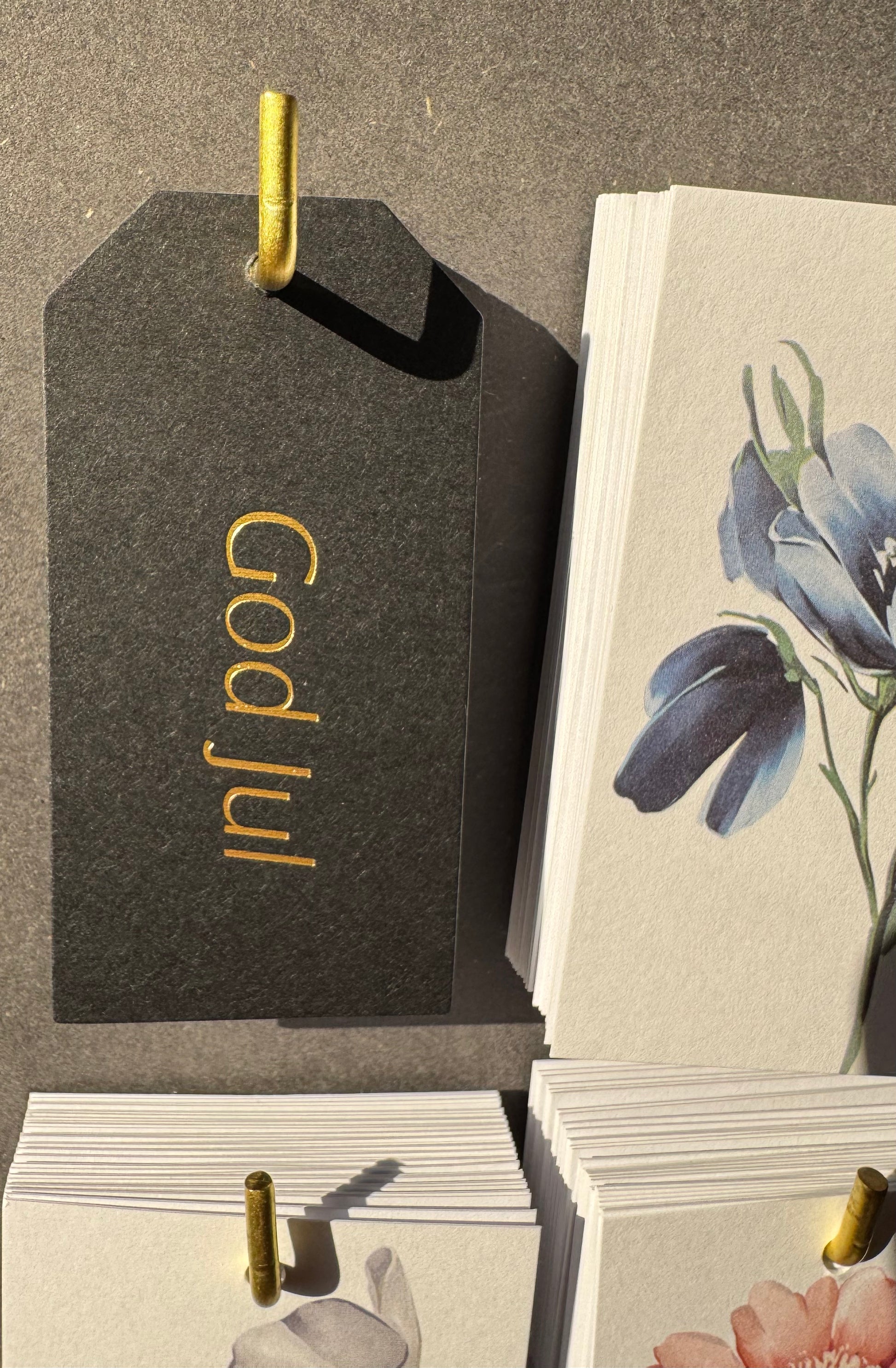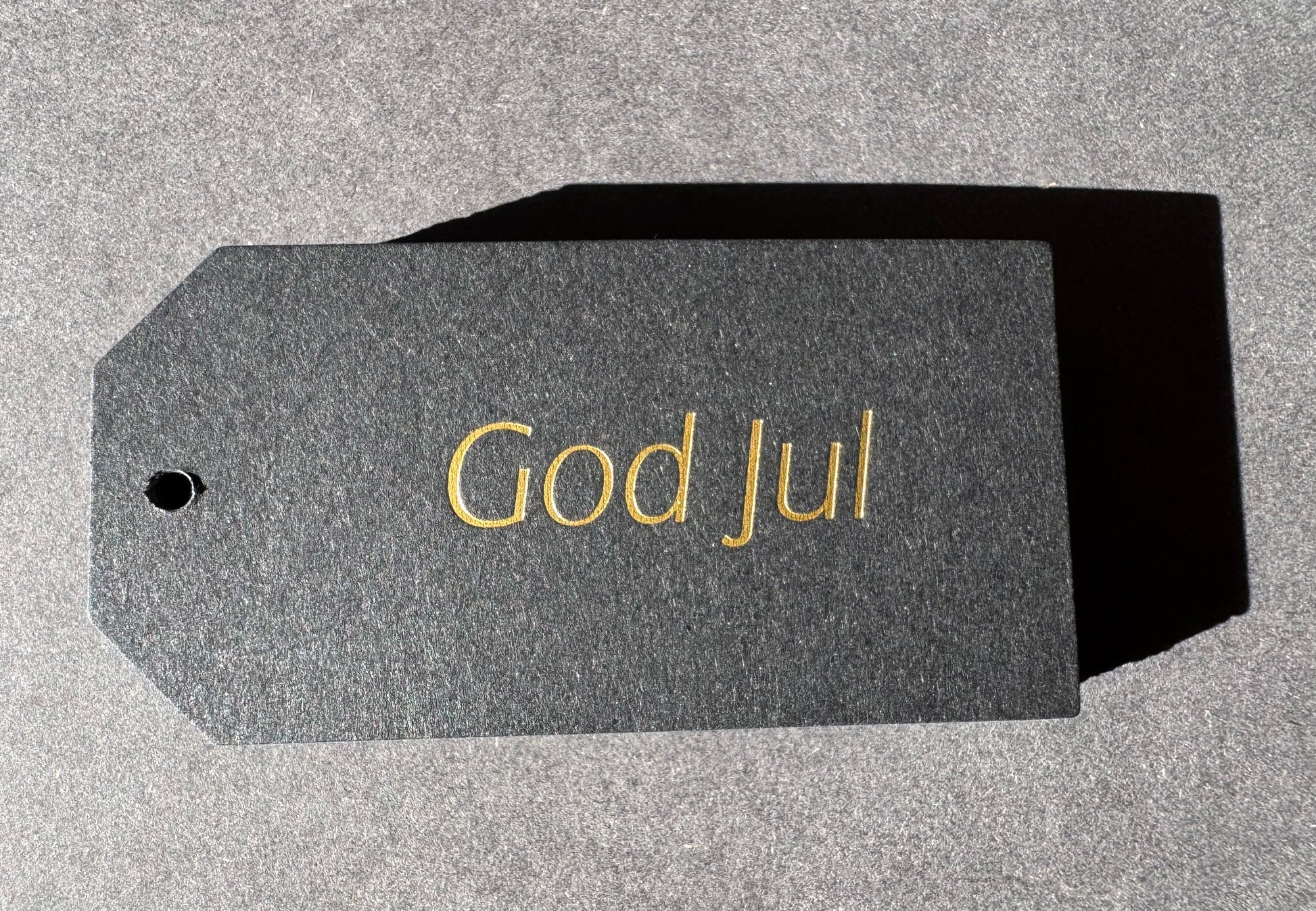 God Jul tag 4 x 8 cm, Guld tryck på svart kraftpapper